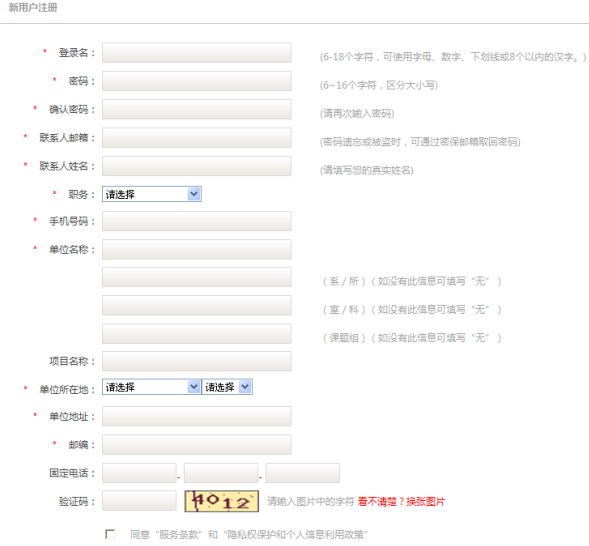 2.進入注冊頁面,根據要求認真填寫注冊信息,帶紅色標記的為必填項,并同意注冊條款,就可生成新用戶。