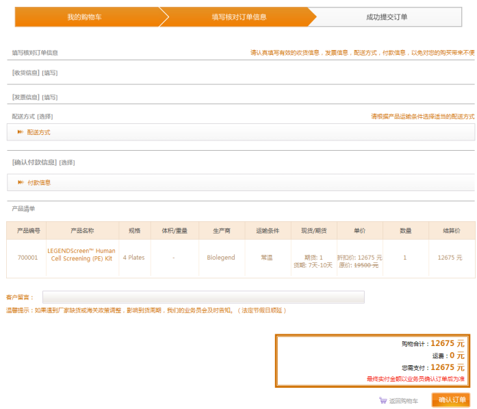 點擊購物車頁面的“結算”進入填寫訂單信息的頁面,在此頁面請認真填寫,收貨地址、發票信息、配送方式、支付方式等信息。點擊“確認訂單”即可生成訂單。