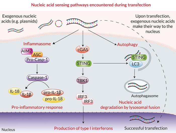 在真核細胞轉染期間,外源核酸(如質粒DNA)的主要障礙是它們會被胞質傳感器檢測,如cGAS/STING,AIM2炎癥小體和LC3介導的自噬。這些防御性級聯信號的激活通常會導致低轉染效率、降低的細胞活力和不一致的結果,尤其是在難轉細胞(如免疫細胞)的轉染實驗中。NATE?抑制許多核酸感應途徑,從而保護外源DNA并促進其表達。