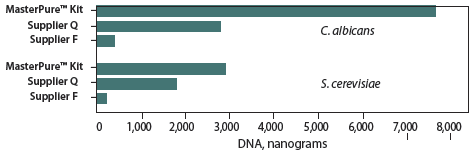 分別提取S.cerevisiae和C. albicans.中的DNA,用熒光染料33258對DNA進行定量分析(RNA對該定量幾乎沒有影響)。圖中顯示的是兩次實驗的平均DNA得率 。MasterPure Kit對C.albicans的提取量相比其它試劑盒高17倍;對S. cerevisiae的提取量相比其它試劑盒高12倍。