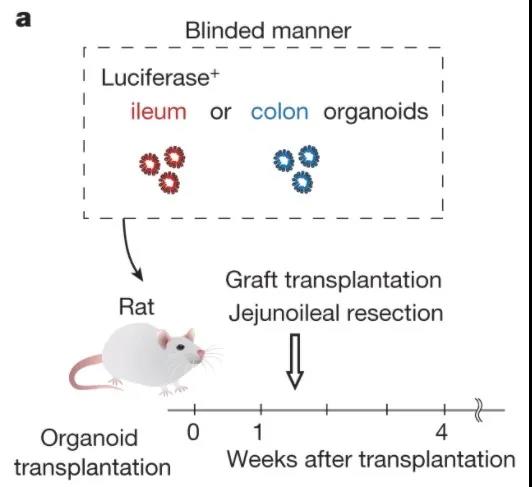 以單盲的方式移植回腸或結腸類器官的實驗策略。
