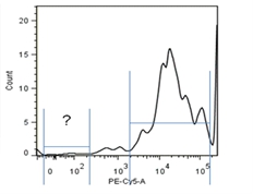 補償調節抗體的正確選擇對于熒光通道之間的補償調節是非常重要的。要求選擇的抗體所結合的抗原分子在樣本細胞中有明確表達,占樣品細胞的10%以上,50%以下。如果陽性細胞比例太低,在陽性細胞區域無法形成明顯的細胞團,無法判斷調節是否合適。如陽性細胞比例過高,則不表達該抗原的陰性細胞無法形成明顯的細胞團,如圖1-4直方圖所示。