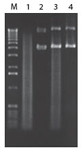 泳道3:Plasmid-Safe? DNase處理前,3ug的消化的染色體DNA和500ng未消化的質粒DNA;